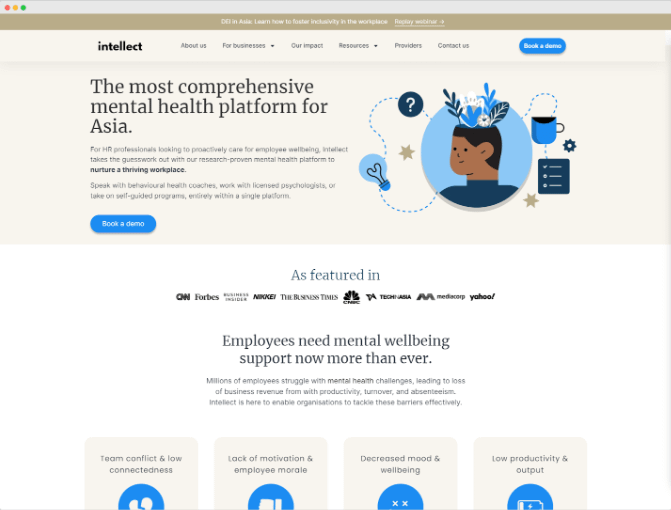 Intellect is a Singapore-based startup that aims to make mental health care more accessible and affordable in Asia. It offers a comprehensive mental health platform with various features and services, such as a self-care app, skill-building programs, behavioural health coaches, counsellors, psychologists, and full-stack clinical EAP services.