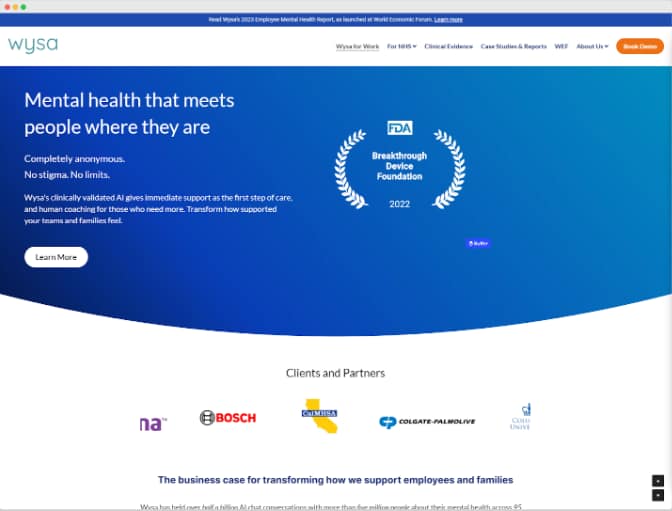 Wysa is a UK-based startup that aims to provide affordable and accessible mental health care for everyone. It offers a comprehensive mental health platform with various features and services, such as a self-care app, skill-building programs, behavioural health coaches, counsellors, psychologists, and full-stack clinical EAP services.